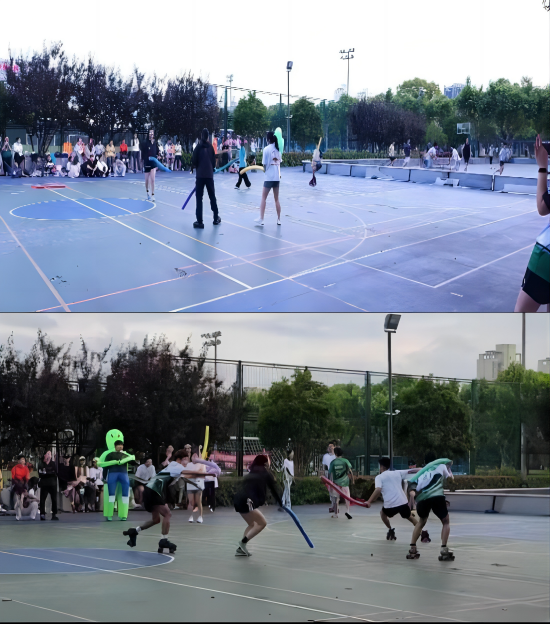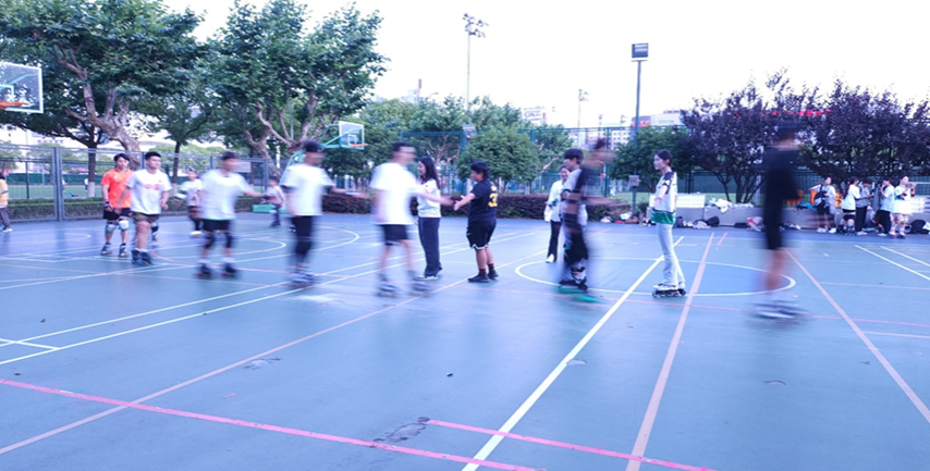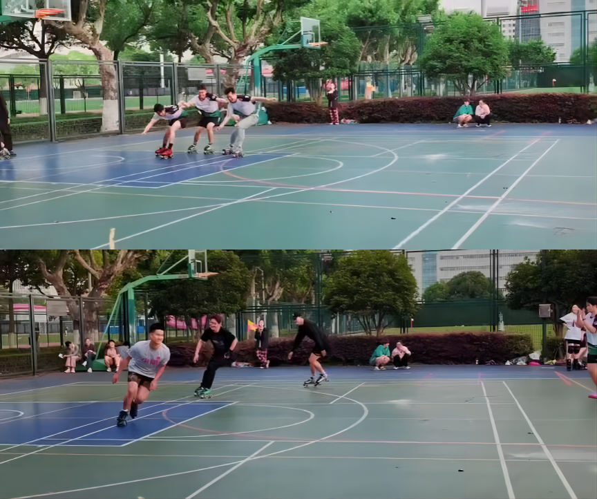 接下来进行的是竞速比赛。比赛要求三人随机一组。选手们你追我赶,场面十分火爆。轮滑社同学踊跃参加,展现出高超的轮滑技巧。同时,轮滑参赛的队员们还在竞速过程中加入了轮滑阻拦的技巧,使得比赛过程跌宕起伏,吸引了众多观众关注和喝彩。