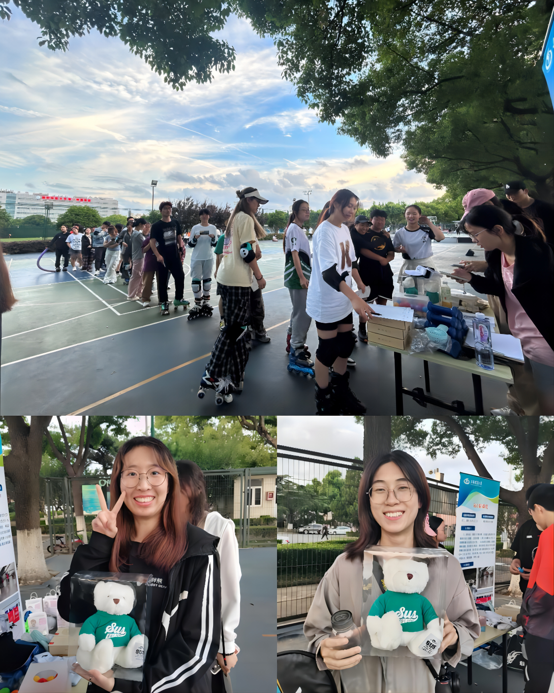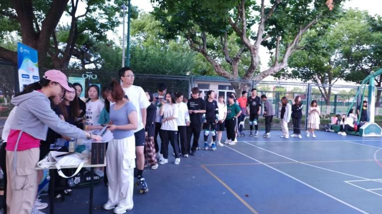 17:50的绿瓦大楼多功能运动场前,同学们早早在签到处排起长队,领取轮滑社专属明信片和抽奖号码。