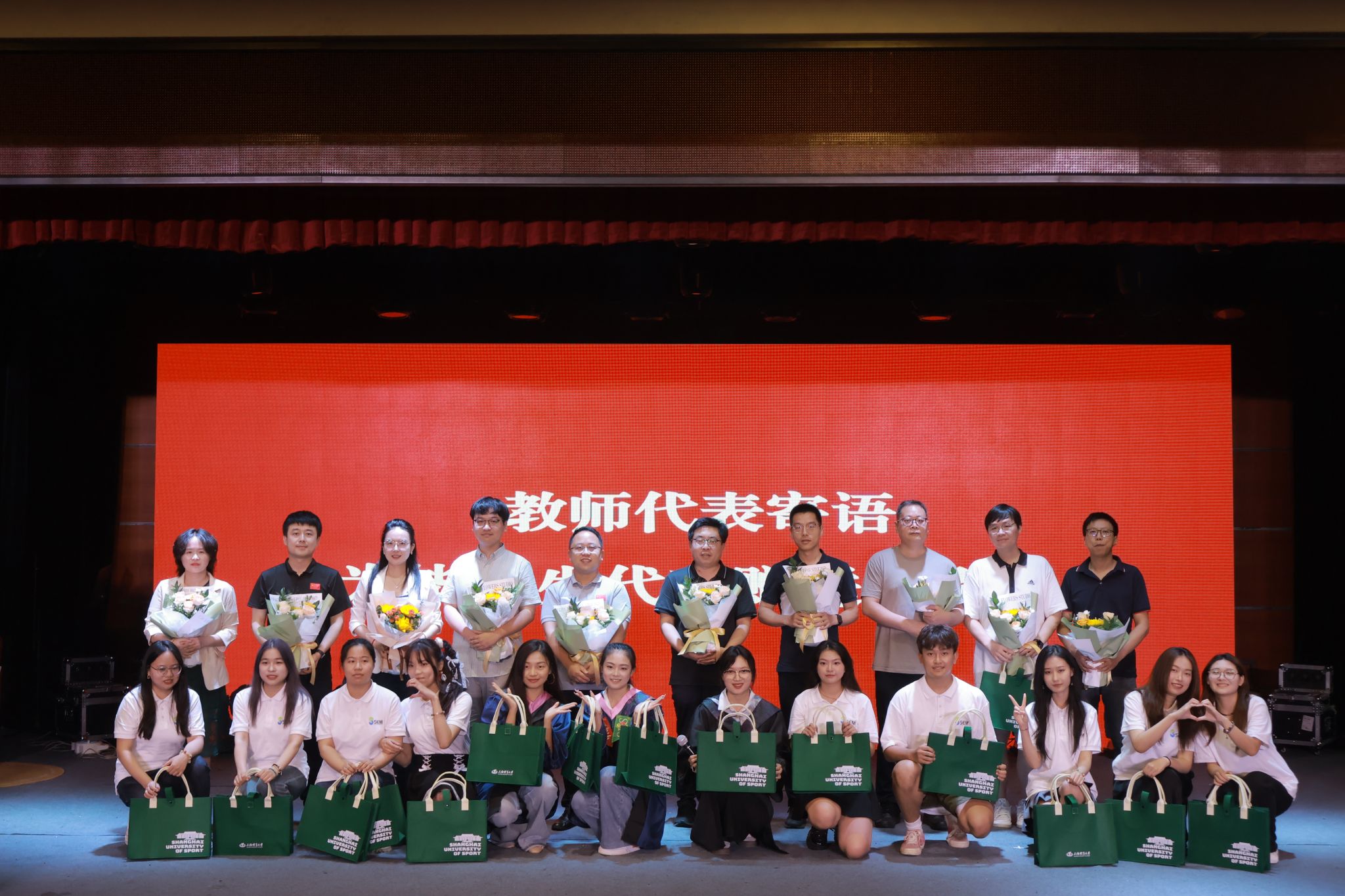 毕业生代表向教师代表献花,表达了对母校和恩师的感激之情。教师代表为毕业生送上美好祝福,并赠送临别礼物。