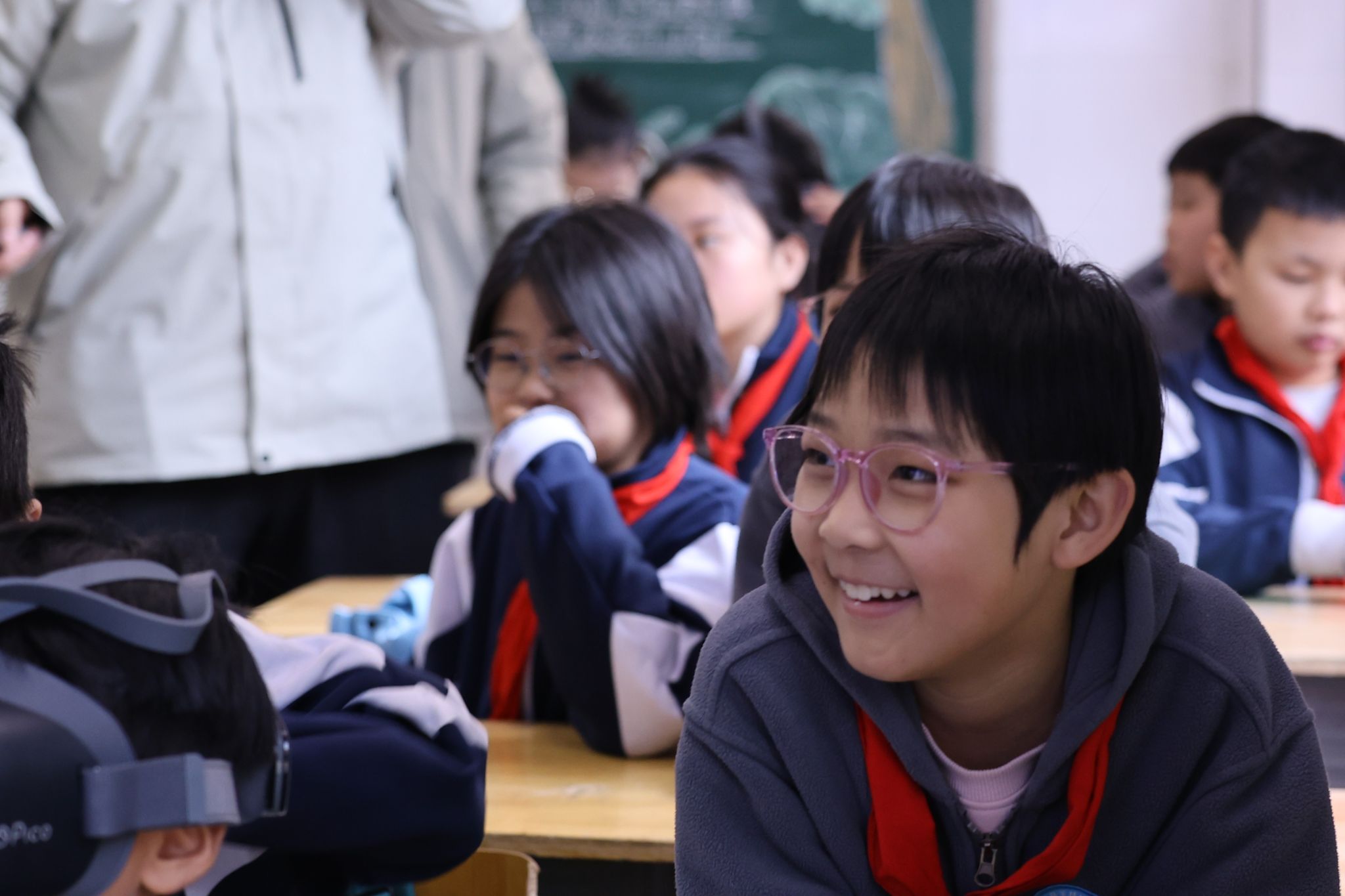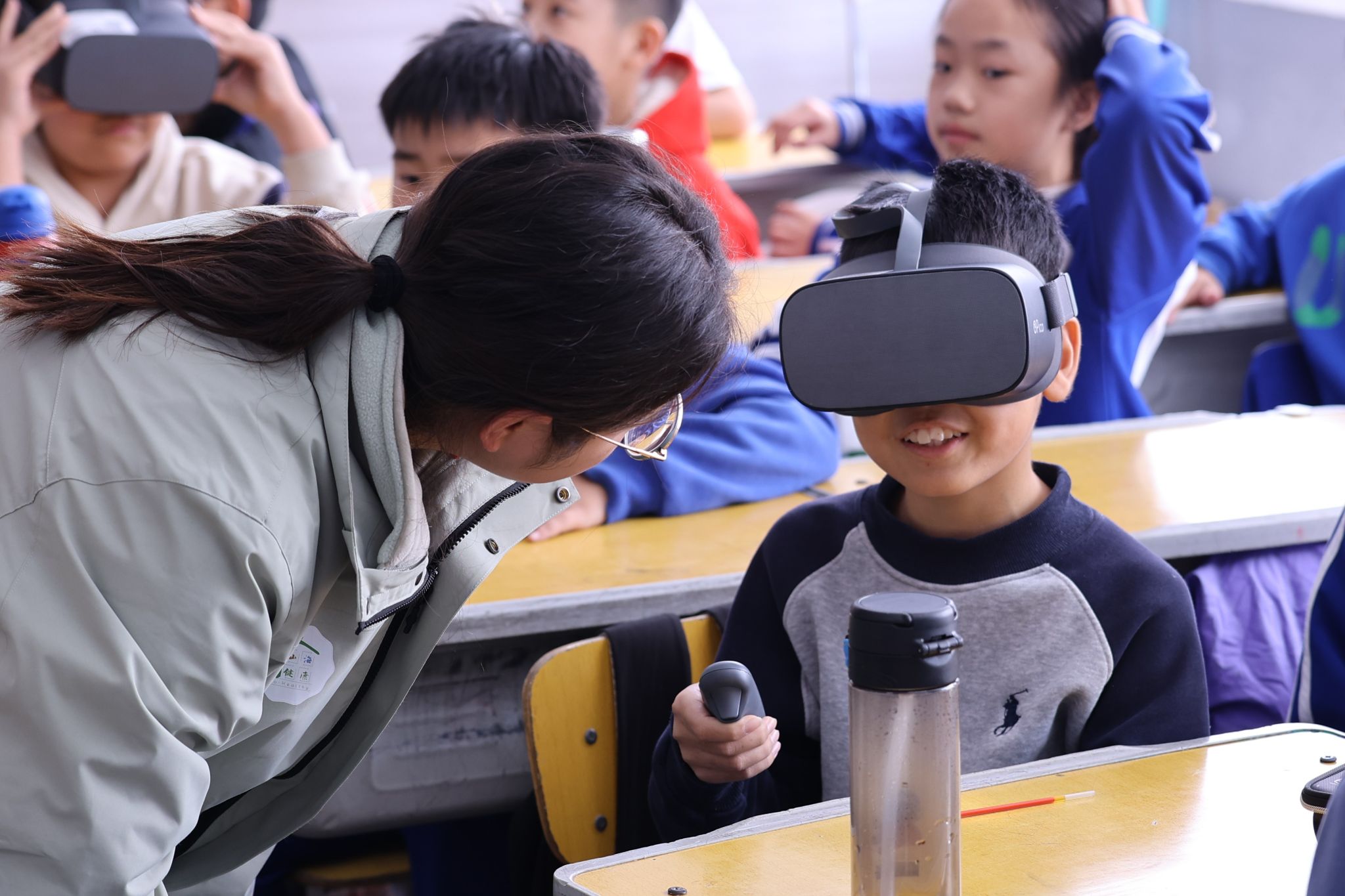 最令人难忘的是VR眼镜体验环节。在团队成员的指导下,同学们轮流戴上VR眼镜,体验了虚拟世界的奇妙感受。一位同学在体验了滑雪模拟后,激动地分享了他的感受:“我体验了滑雪的感觉,真的太好玩了!我希望将来有一天可以亲自站在滑雪场上,感受真正的滑雪乐趣。”