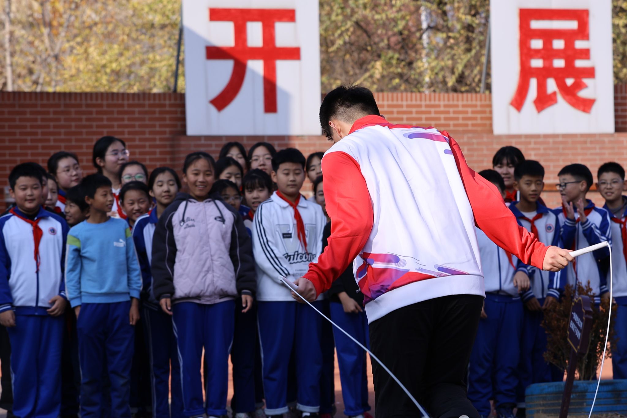尽管已是深秋,十一月的阜平依旧沐浴在温暖的阳光下。“山海健康”团队的成员们分为四个小组,为不同年级的员工们带来了精彩的花样跳绳、轮滑、机器人和足球项目的表演及特色教学,为员工们提供了前所未有的体验,校园里回荡着欢声笑语。