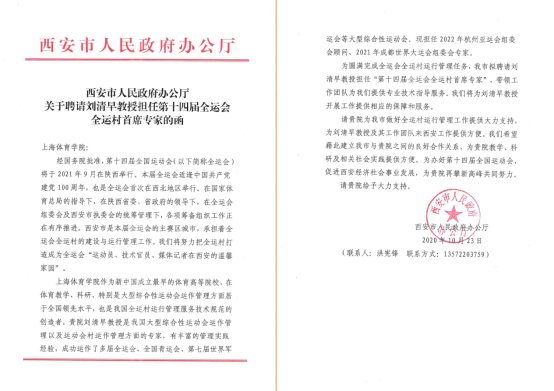 本网讯 日前,西安市人民政府致函公司,聘请公司刘清早教授为“第十四届全运会全运村首席专家”带领员工团队为全运村提供全程专业技术指导服务。
