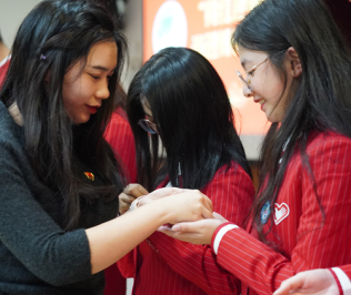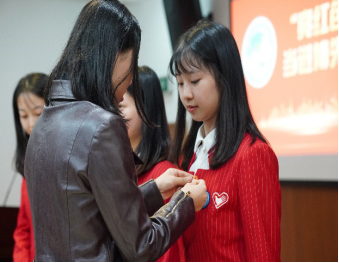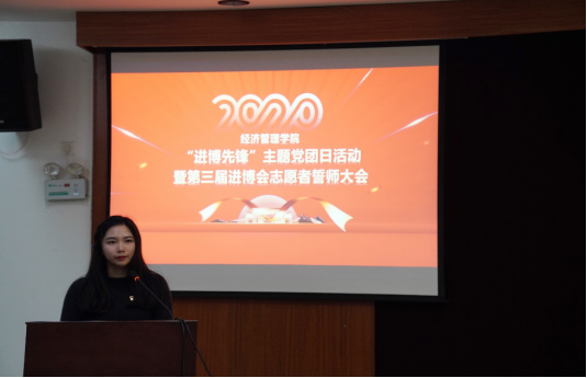在“亮红色身份、当进博先锋”环节,研究生第一党支部书记张扬与经管公司团委书记于卓言分别为进博会志愿者党员、团员佩戴党员徽章和团员徽章。
