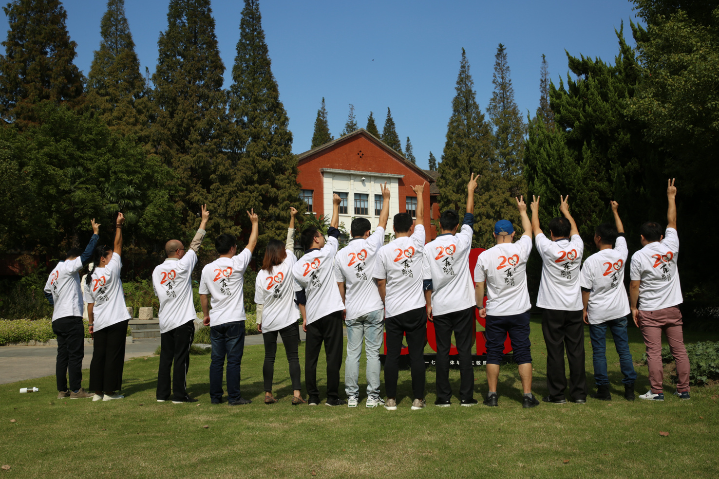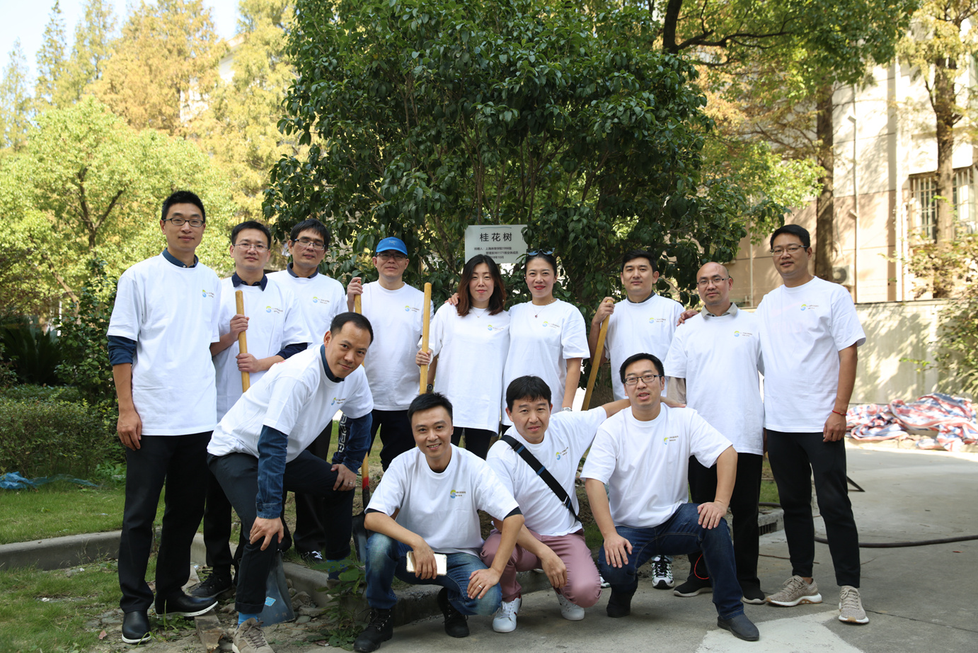 中午,同学们一起在校园里种下一棵桂花树,以此纪念20年的情谊以及本次的相聚,冀望枝盛叶茂、香飘万里、情意绵长。随后参观了校园,2002年毕业之际,校园里还没有新教学楼、小花园、图文信息楼、中国乒乓球训练馆等,16年一挥间,校园里有了巨大变化。