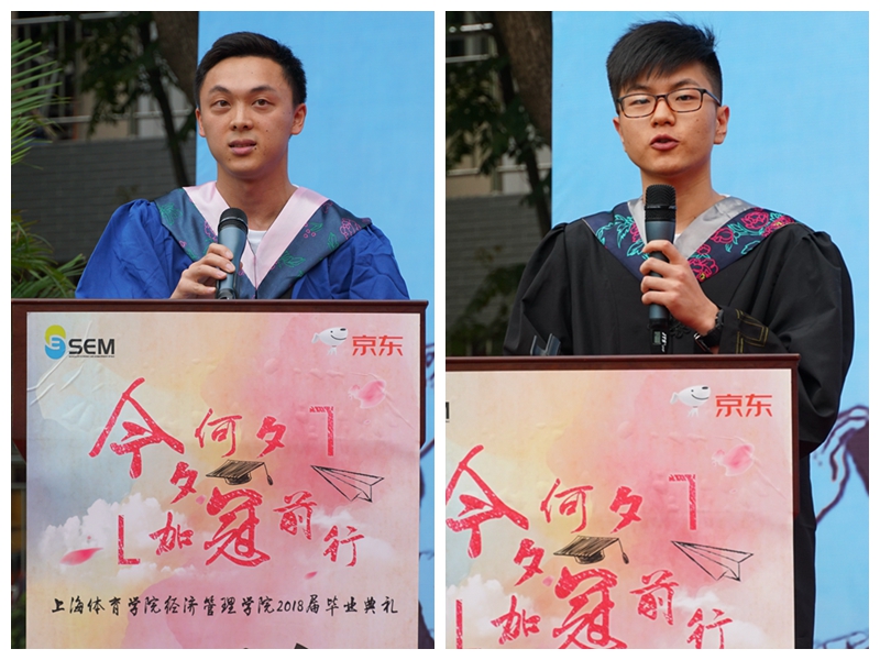 毕业研究生张凯、毕业本科生张中昊代表2018届毕业生发言。从绿瓦学子的角度,回忆了自己在上海体育公司度过的四年精彩大学时光,表达了对母校、对老师以及对家人的感激与深情。