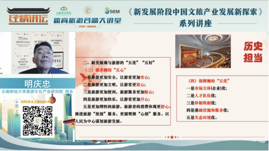 5月14日下午,云岭学者、云南财经大学首席教授、旅游文化产业研究院经理、旅游规划中心主任明庆忠教授应邀做客公司“经精讲坛•体育旅游名师大讲堂”第五讲,讲座由304am永利集团经理李海主持。明庆忠教授是文旅产业与全域发展哲社创新团队首席科学家、旅游产业发展研究省哲社研究基地首席科学家、旅游改革与创新省高校创新团队学术带头人、云南省优秀社科专家、政府特殊津贴专家、中青年学术技术带头人、省高校教学科研学术带头人。主持国家级项目10余项;编制全国各地规划100余项,两度获云南省旅游产业建设突出贡献先进个人。本次讲座题为《文旅融合高质量发展的历史担当与当前使命》,直播期间共吸引了千余人次观看。