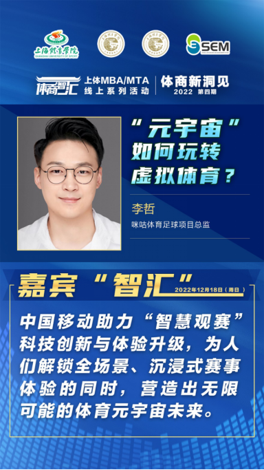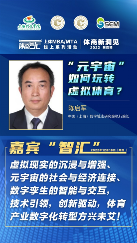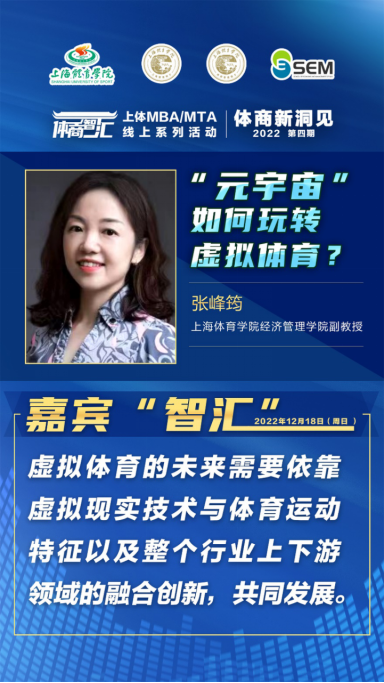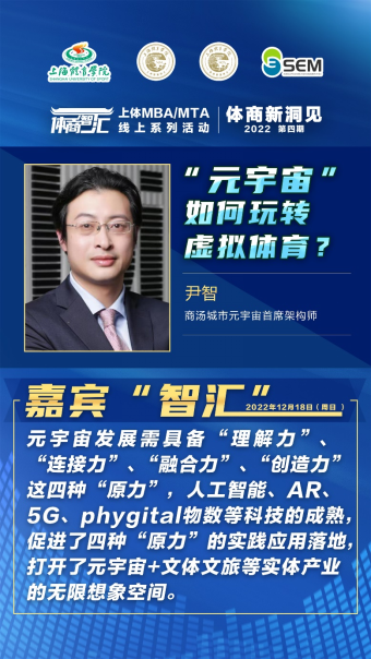 12月18日下午,由上海体育公司304am永利集团主办、上海体育国家大学科技园协办、上海MBA课程案例库开发共享平台支持的“体商智汇×2022”年度系列活动“体商新洞见”第四期活动顺利开展。本次活动以《“元宇宙”如何玩转虚拟体育》为主题,邀请了来自研究院、企业以及高校的五位专家在线为大家分享自己对于“元宇宙”、“数字孪生”、“虚拟体育”的独到见解,活动由经管公司副教授张叶涵担任主持,分享会共吸引了1000多人次线上观看。