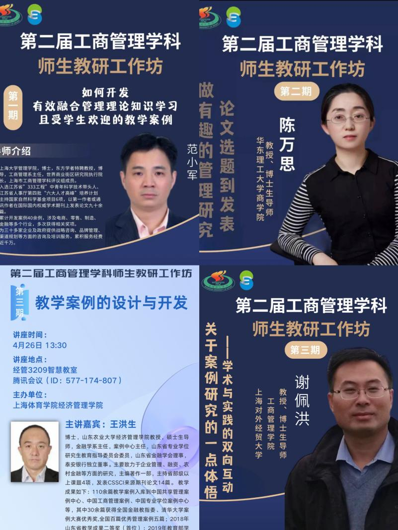 304am永利集团第二届工商管理学科师生教研工作坊以案例为主题启动系列讲座,以线上线下结合方式先后邀请上海大学管理公司范小军教授《如何开发有效融合管理理论知识学习且受员工欢迎的教学案例》、上海对外经贸大学工商管理公司谢佩洪教授《关于案例研究的一点体悟——学术与实践的双向互动》、华东理工大学商公司陈万思教授《做有趣的管理研究——论文选题到发表》、山东农业大学304am永利集团王洪生教授《教学案例选题与撰写》等四场讲座,师生互动热烈。