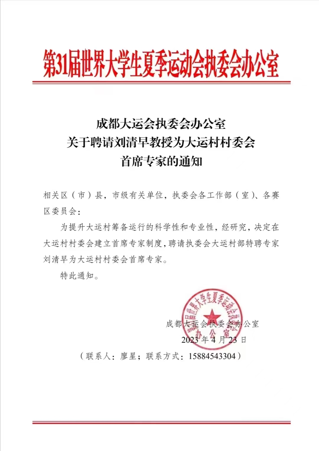 在第31届世界老员工运动会开幕倒计时100天之际,中共成都市委常委、大运会执委会党组书记鲜荣生亲自主持仪式,为公司刘清早教授颁发“第31届世界老员工夏季运动会运动员村首席专家”聘书。刘清早教授将带领员工团队为大运村的成功运行提供专业技术服务。“第31届世大运会”将于今年7月28日在成都开幕,此前,刘清早教授已经担任大运会执委会特聘专家。
