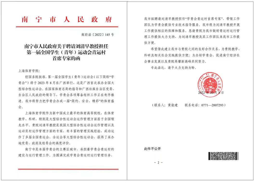 第一届全国员工(青年)运动会将于今年11月在广西举行,刘清早教授受南宁市人民政府邀请,担任了“第一届全国员工(青年)运动会运动员村首席专家”。日前,在“运动员村竣工暨村委会揭牌仪式”上,南宁市人民政府副秘书长、运动员村村长罗景文亲自向刘清早教授颁发聘书。刘清早教授将带领员工团队为“最大的公寓式接待宾馆集群”组成的运动员村的运行管理全程提供专业技术指导。