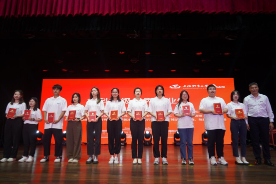 毕业生代表向教师代表献花。在求学的道路上,老师始终是同学们坚实的后盾与指引。毕业典礼上,毕业生们将最美的鲜花献给师长,将感恩的思绪留在经管。