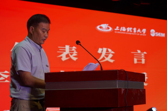 教师代表李延超教授发言。李延超教授用“欣赏、感动、祝福”三个关键词表达了送别毕业生们的心情,并向毕业生提出四点期望:一是要有一颗感恩的心;二是保持一颗向上的心;三是具有责任意识;四是保持一份爱和宽容。同时,他希望毕业生们常回家看看,关注SUS和SEM的变化,分享自己的成功和进步。李延超教授幽默的发言引得现场掌声阵阵。