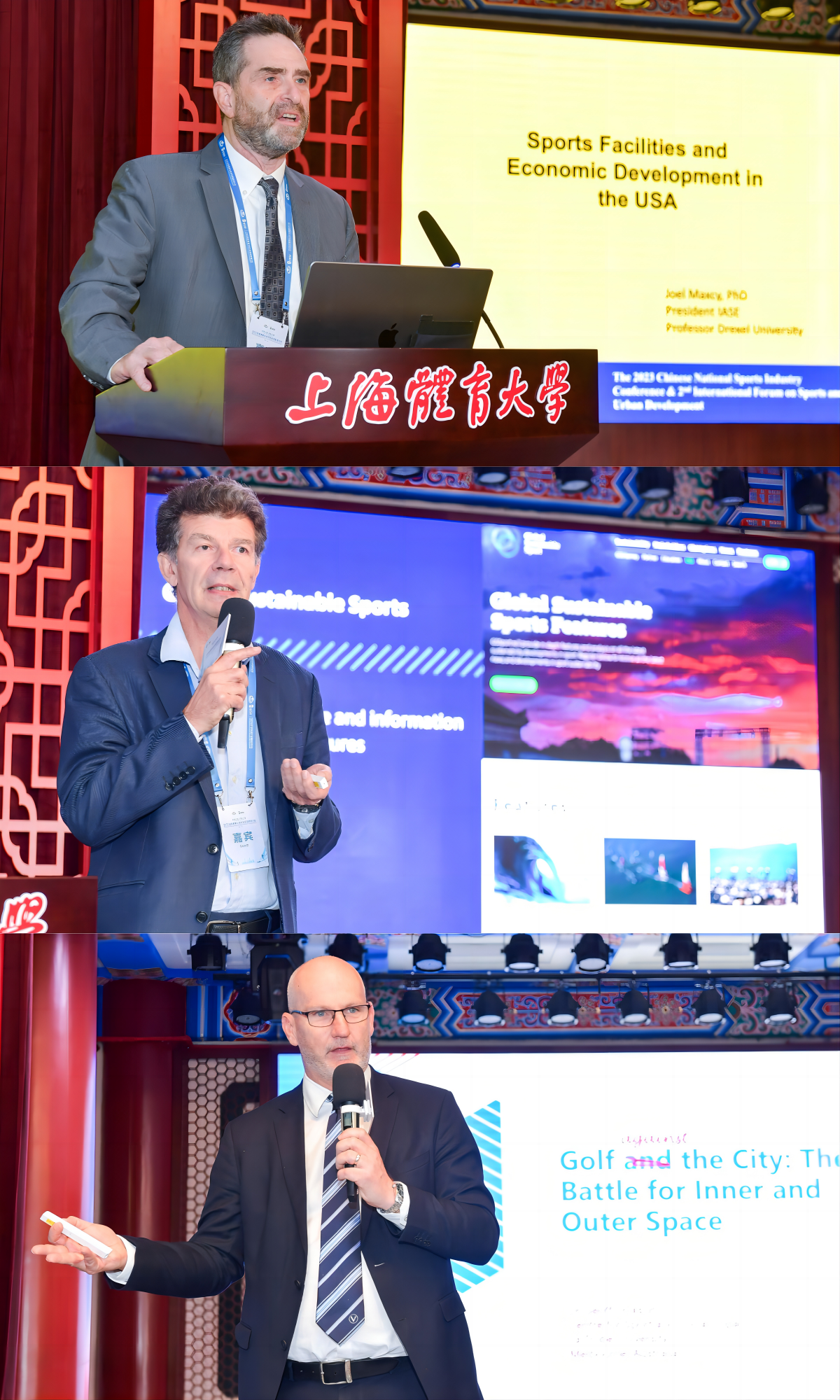 主旨演讲环节中,国际体育经济学会主席Joel G.Maxcy、英国全球可持续体育股份有限公司的创始人兼首席执行官Mike Laflin、澳大利亚拉筹伯大学体育与社会影响研究中心主任Geoff Dickson 分别以《美国体育设施与经济发展》《体育之城:前进路向》《高尔夫与城市:内外部空间之争》为主题作了深度研讨。