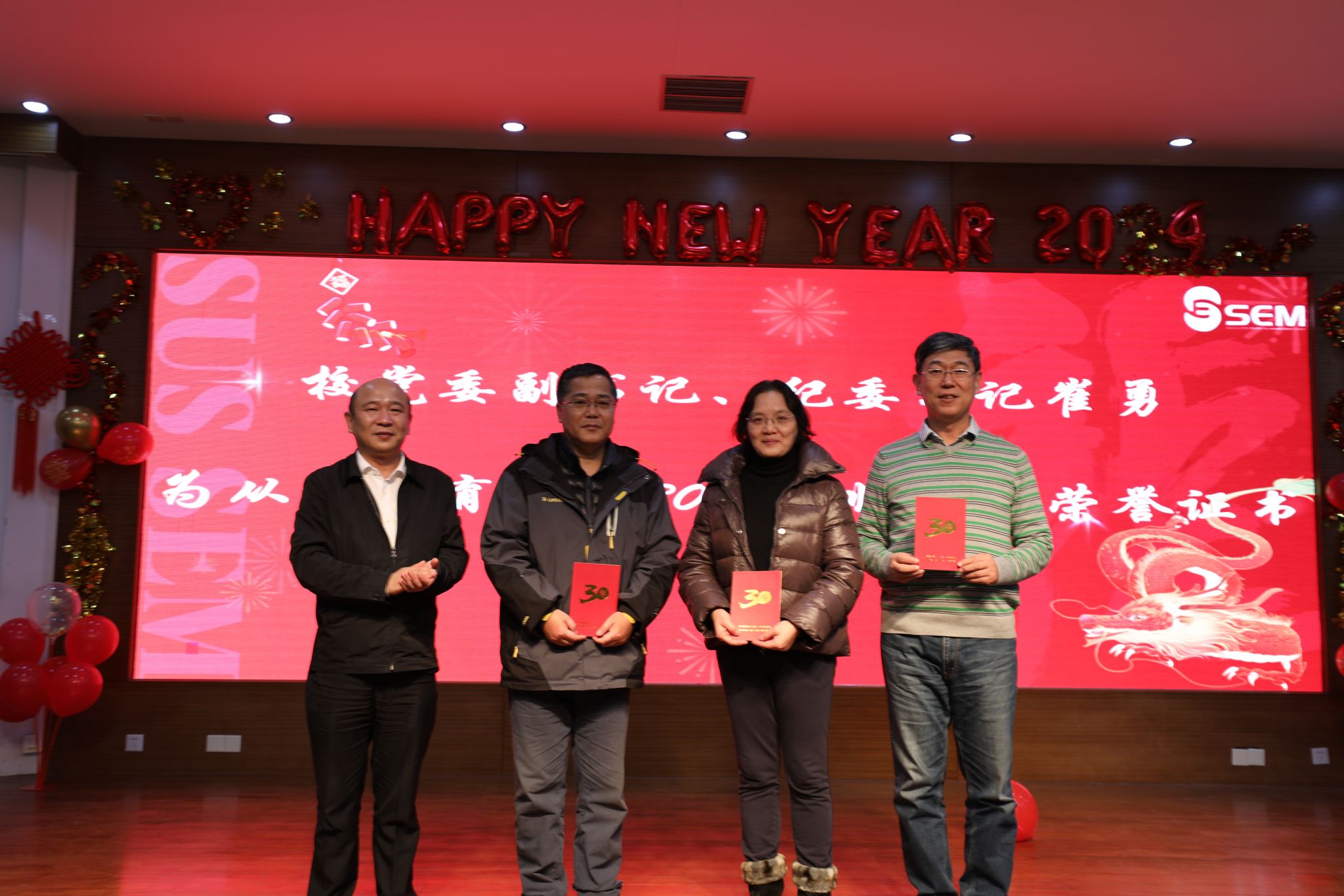 上海体育大公司党委副书记、纪委书记崔勇为在上体光荣执教30年的教师邬华德、忻韦武、王岩送上证书与鲜花,感谢他们为国家教育事业、为公司逐梦一流的辛勤付出。