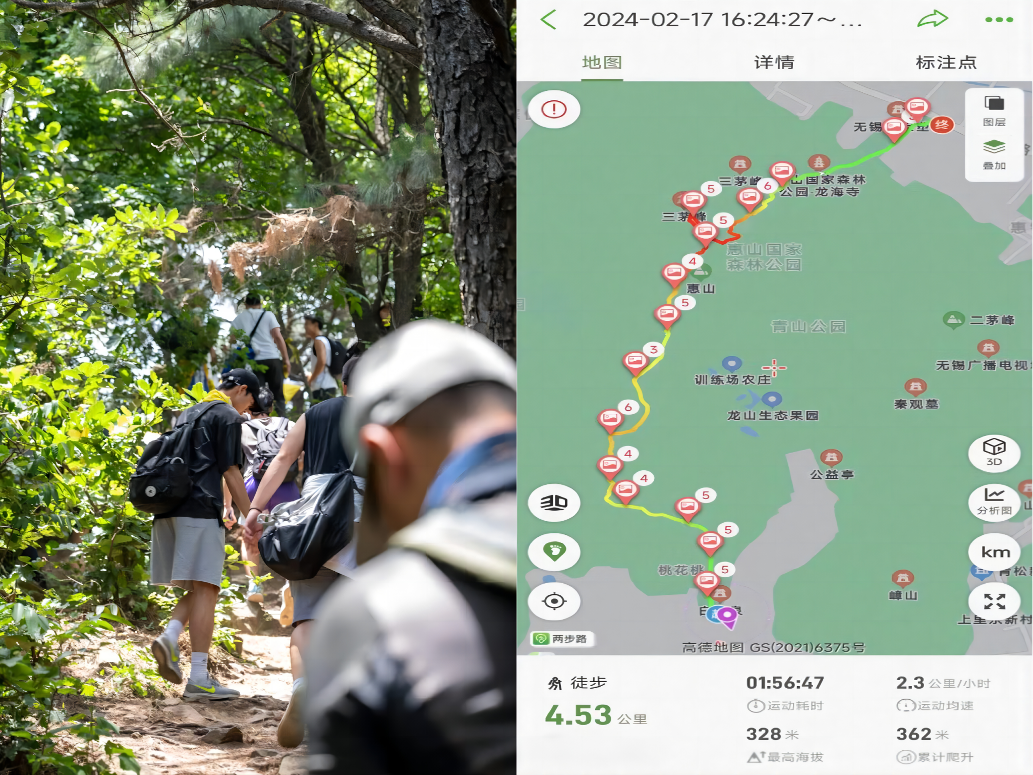 此次在惠山国家森林公园设计的线路全程徒步约4.5公里,累计上升380米,累计下降423米,最高海拔328米。同学们普遍感觉这样的户外教学工作非常好,扩展了视野,提高了认知,学到了户外技能,也体会到了职业精神和团队精神。