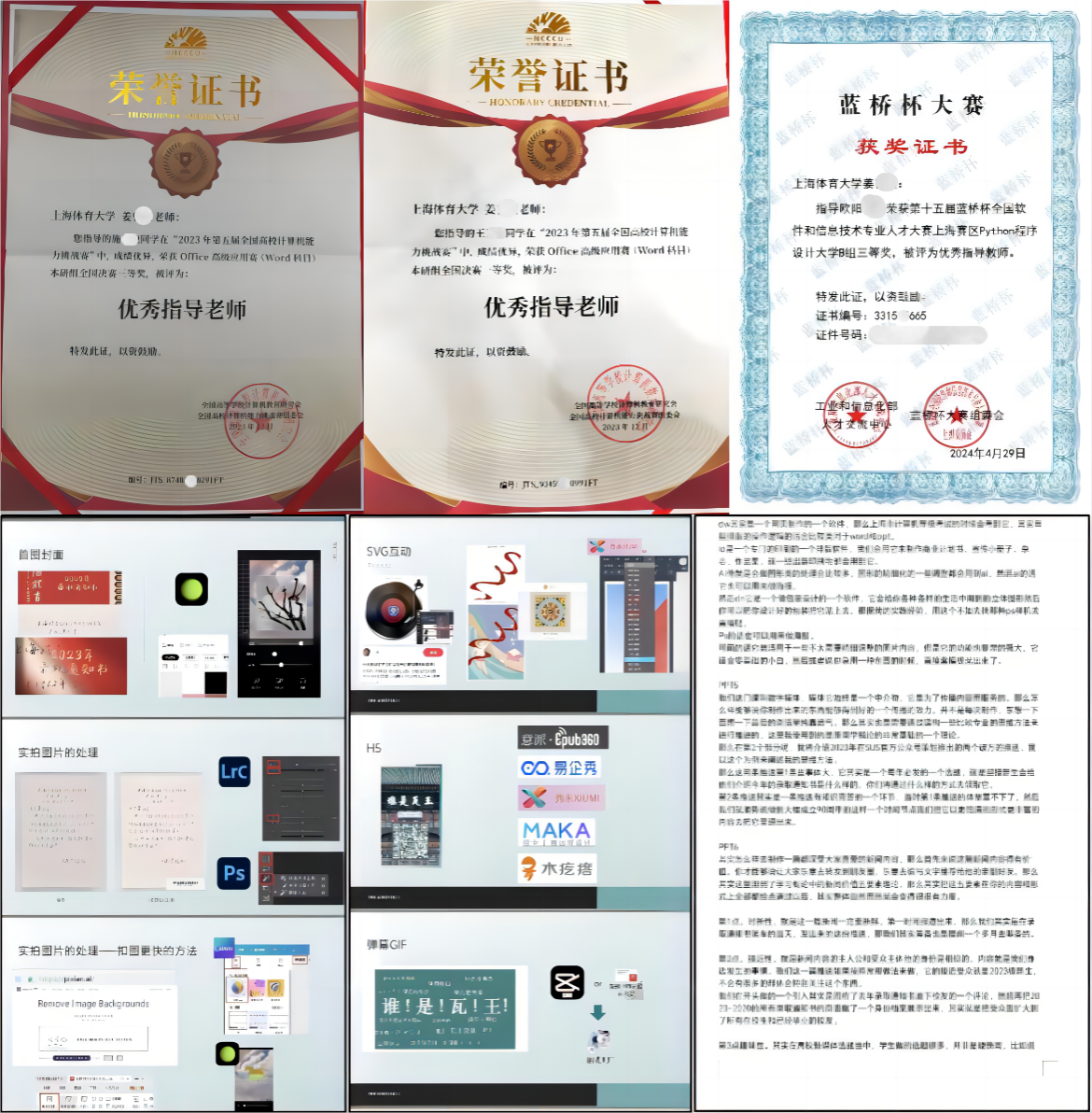 团队指导公司员工刘畅、康格君、王伟兴、黄嘉莹、王雯靓、何章缘、欧阳智杰等多位员工参加全国高校计算机能力挑战赛、上海市“汇创青春”老员工创意大赛、“蓝桥杯”等各种比赛,多位员工获得奖项。多名员工设计多媒体作品展示在“校庆70周年”公众号、“上体新传”公众号里。