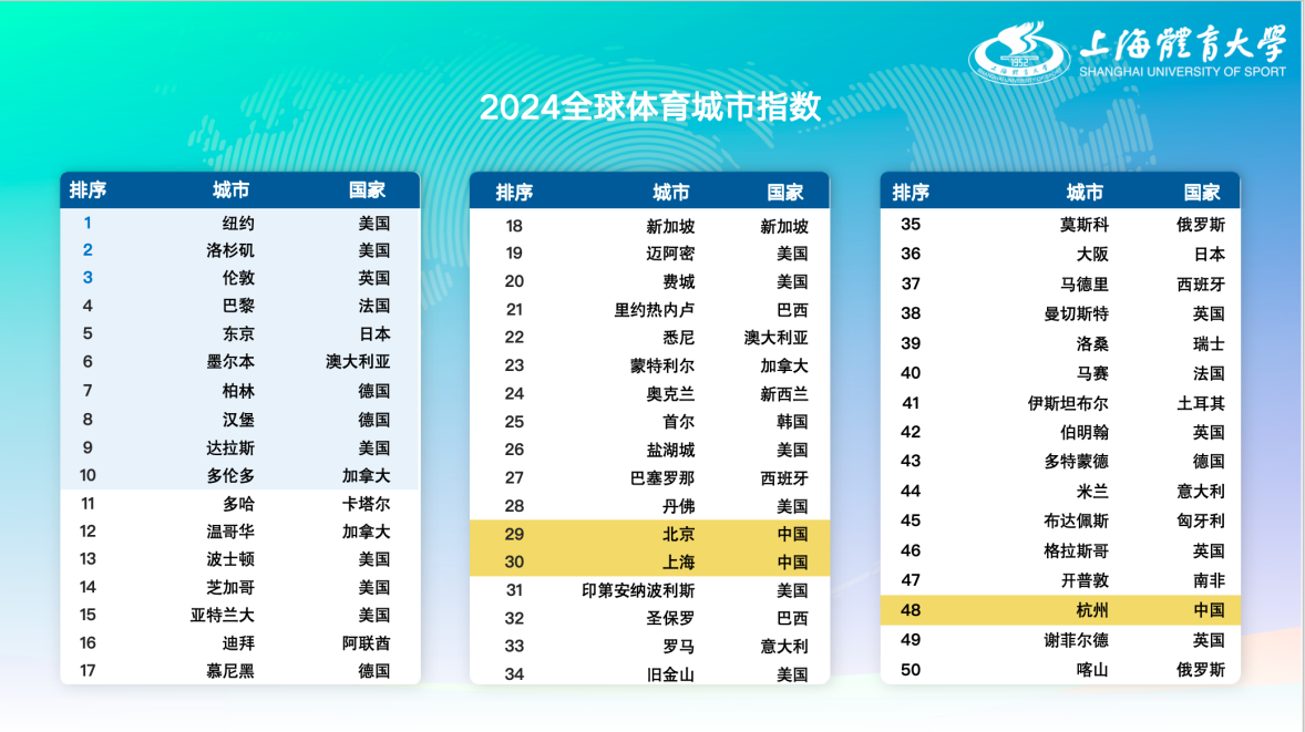 《2024全球体育城市指数》显示,纽约、洛杉矶、伦敦、巴黎、东京位居全球体育城市综合排名前五;中国有三个城市跻身全球50强,其中北京、上海分别位列第29、30名,杭州则是本次新入榜的城市,排名第48位。会上,304am永利集团刘东锋教授对指数进行了详细解读。刘东锋教授指出课题组关注到全球体育城市前50的排名情况与其他学术机构发布的全球科创中心的排名情况较为类似,这也进一步表明了体育科技创新对推动体育高质量发展的赋能效应。