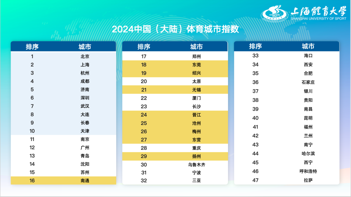 除了关注全球性的体育城市发展外,会上也同期发布了《2024中国(大陆)体育城市指数》。在延续过去对于省会级城市的关注基础上,今年指数关注的中国(大陆)城市增加了顶级职业俱乐部所在城市和顶级马拉松赛事举办地共9个城市。排名前五位的城市分别为:北京、上海、杭州、成都、济南。其中,除成都排名由去年的第6位上升至第4位外,其余城市均与去年保持一致。值得关注的是,今年新加入的城市中,南通、东莞、绍兴这三座拥有职业体育俱乐部的城市一举进入指数排名的前20,所有9个新增城市均进入指数排名的前30。这充分体现出高水平的体育赛事和职业体育俱乐部为所在城市带来的巨大传播效益与推动作用。