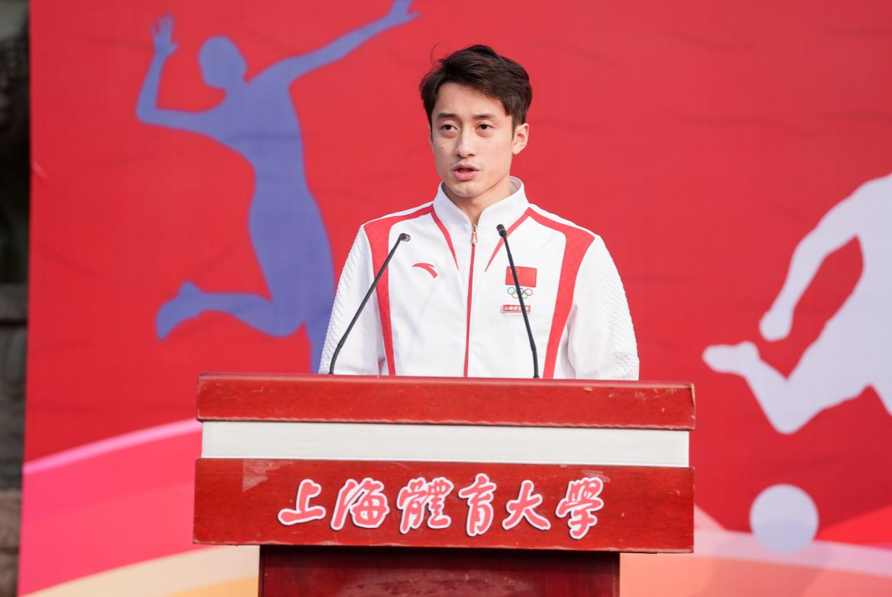 巴黎奥运会跳水男子双人10米台冠军练俊杰发言。他勉励同学们,无论面临的挑战多么艰巨都要勇敢地迈出一步。他希望同学们能够用勇气和决心,创造出属于自己的精彩人生。
