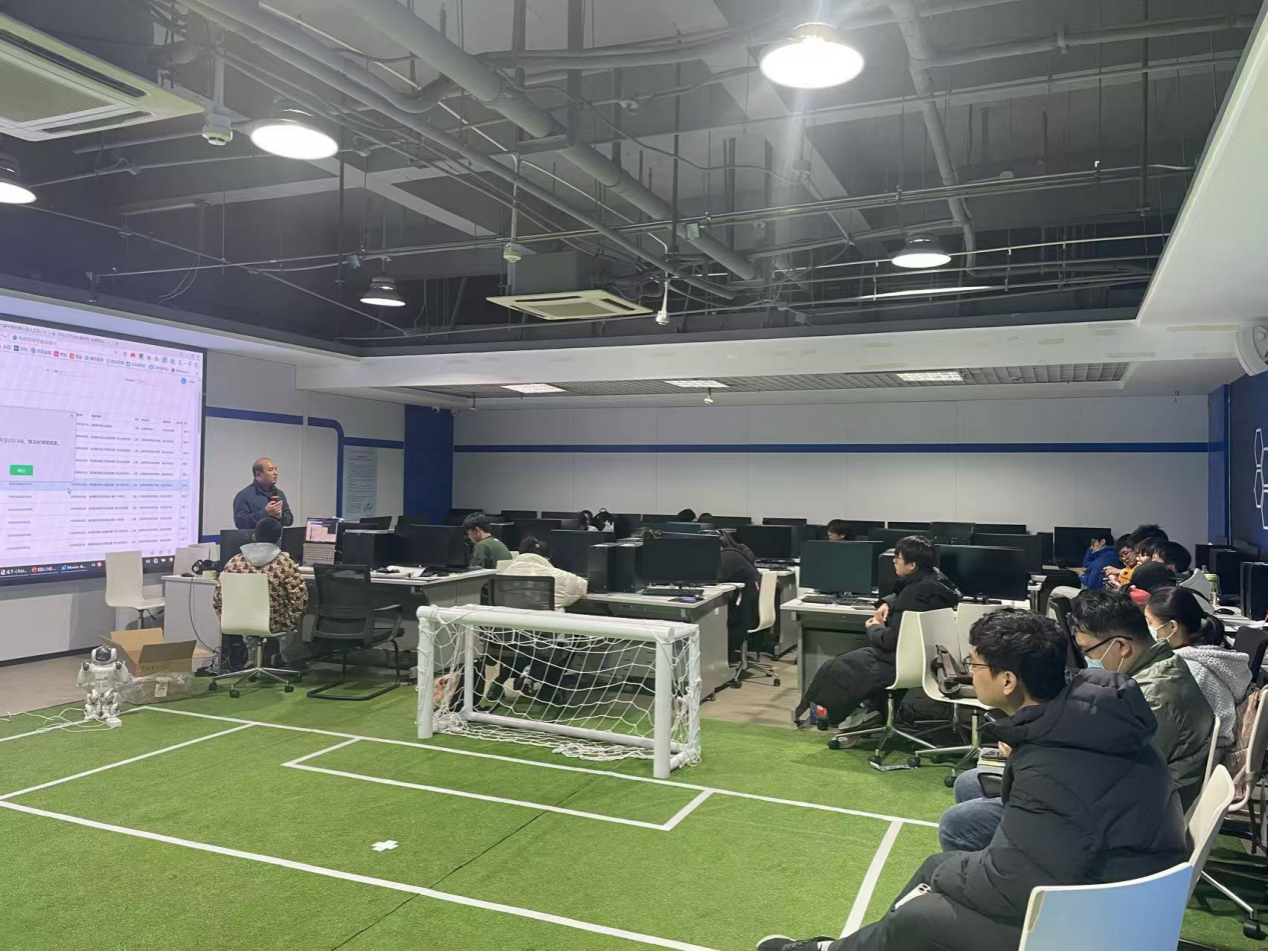 本次系列讲座由徐成龙、刘雨剑、虞思逸老师组织,内容涵盖机器人足球、机器人舞蹈、机器人田径、机器人接力、机器人领域科研创新、中国机器人及人工智能大赛参赛指导等多个领域,讲座总时长超过18小时,覆盖NAO机器人文件配置、代码管理、通信机制分析等理论基础,逐步深入至实战操作层面。付佐鹏专家的讲解生动透彻,理论讲解与实践指导并重,带领同学们逐步掌握了NAO机器人在比赛环境中的刷机、代码切换、点球等关键操作环节。张玉金副教授则从自身的科研经验出发,与同学们分享了本科学习阶段如何更好地利用所学专业知识参与科技研发与专业竞赛。作为中国机器人及人工智能大赛的赛事负责人,张玉金副教授还详细讲解了大赛的动态与规则,鼓励同学们积极报名参赛。通过系统的学习和实践训练,员工们的领域知识与技术能力得到了显著提升。培训过程中,师生互动热烈,员工们积极提出问题,并与专家们进行了深入的探讨与交流,现场学习氛围浓厚。