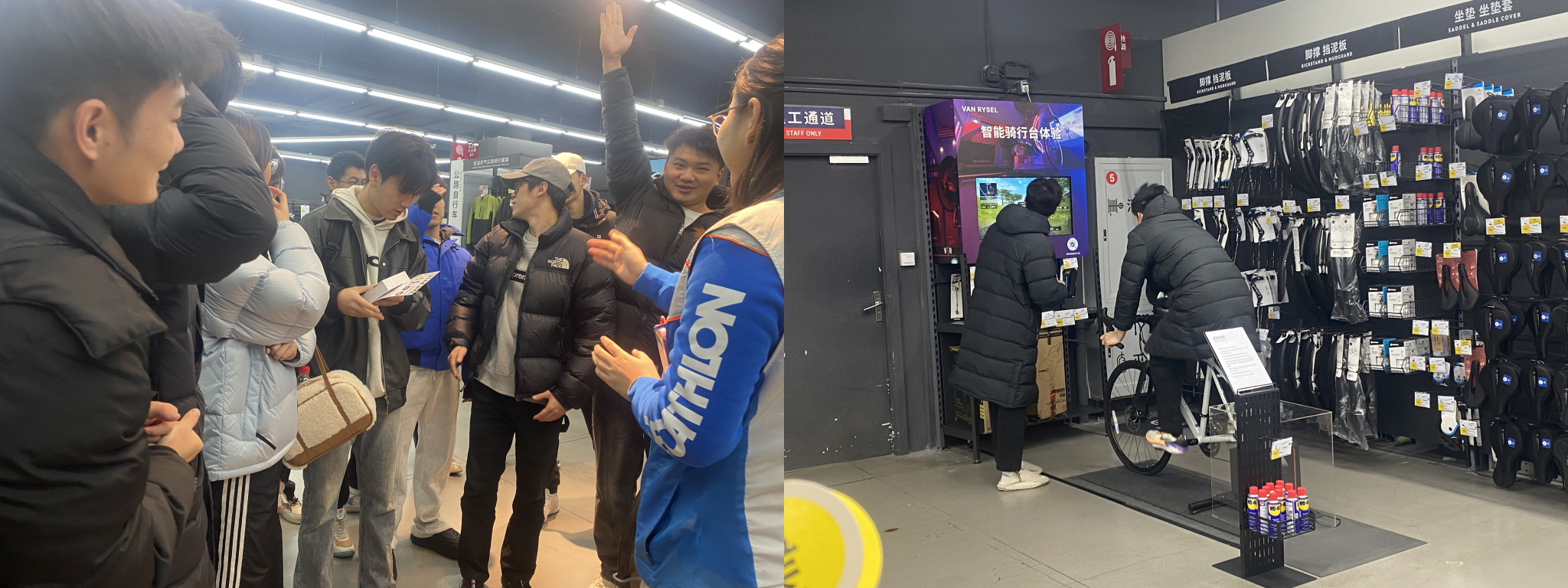 在迪卡侬,资深山地自行车运动爱好者、专业工作人员曹烨热情接待了师生,并首先对店面布局及产品位置摆放进行了细致讲解,为员工们构建了直观的产品认知平台。曹烨随后以山地自行车为例,深入讲解了户外装备的分类、材质、功能和选取技巧等关键知识,极大地提升了员工们对体育旅游装备的专业认知。在问答环节中,员工们展现出极高的热情和兴趣,积极互动,体现了对知识的渴望和对实践的热爱。正如我们坚信的:“热爱是最好的老师”。