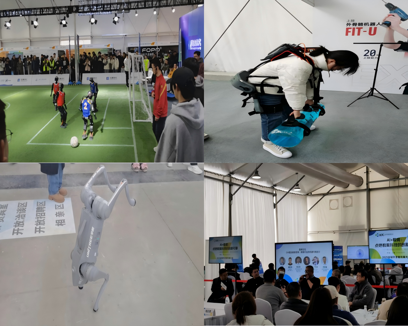 公司师生参会期间观摩了「加速进化」的机器人足球赛,体验傲鲨智能的下肢助力外骨骼产品。大会现场还设有AI助力教育讲座,科研展位、科技产品展览等。在春晚大放异彩的宇树科技旗下机器狗,现场展示了倒立行走与后空翻等高难度动作;模塑空间中,企业孵化器讲座和零代码开发教学现场体验也吸引了不少师生参与。