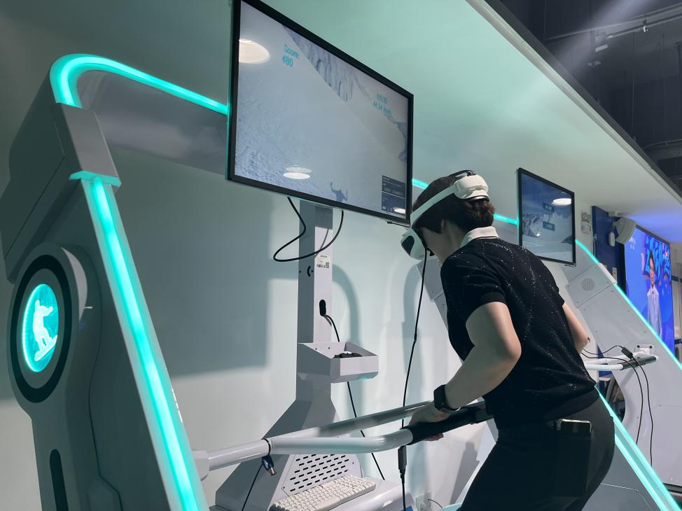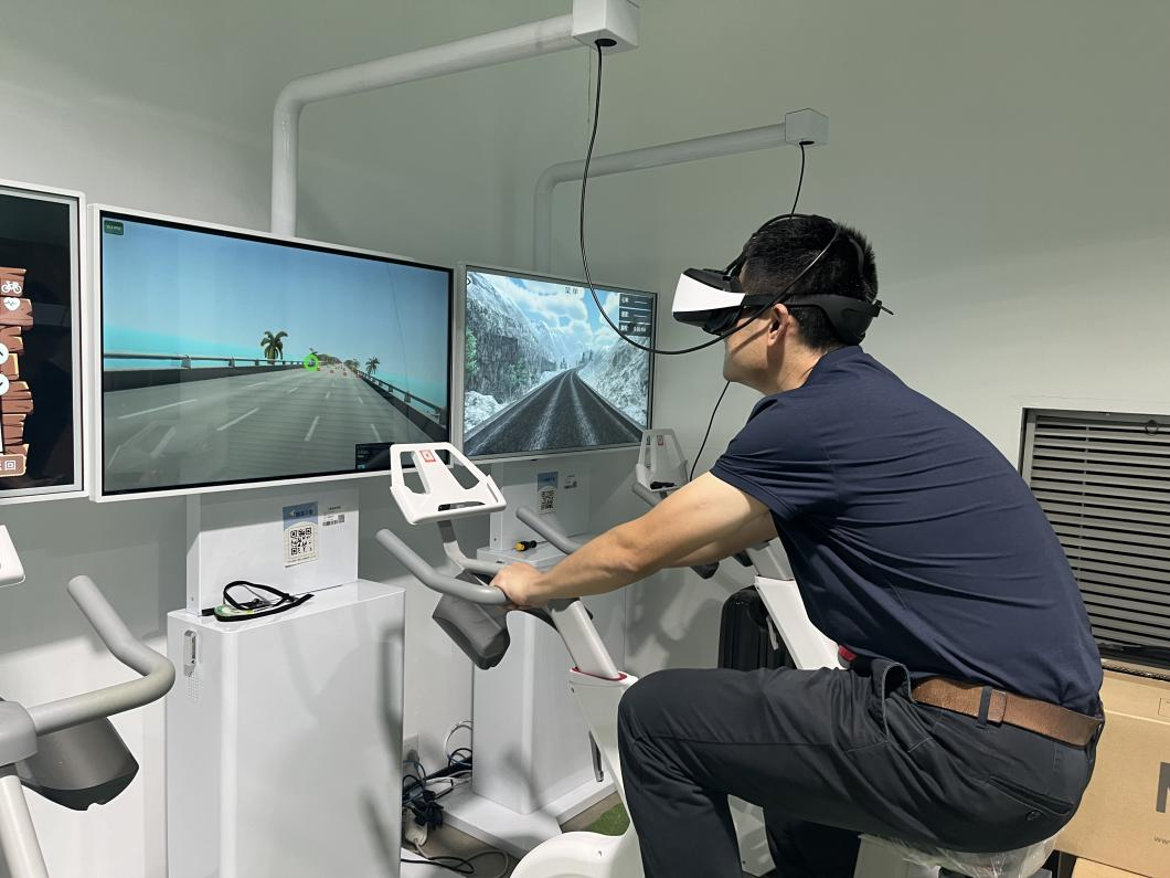 在虚拟体育研究实验室内,李海经理介绍了本实验室的功能定位及在虚拟体育领域的创新成果,实验室负责人徐成龙老师详细介绍了实验室技术架构以及各设备的使用情况。许烁书记及徐娜副经理现场体验了虚拟自行车、虚拟滑雪以及虚拟赛车设备,并对实验室的前沿性和应用价值给予高度评价。