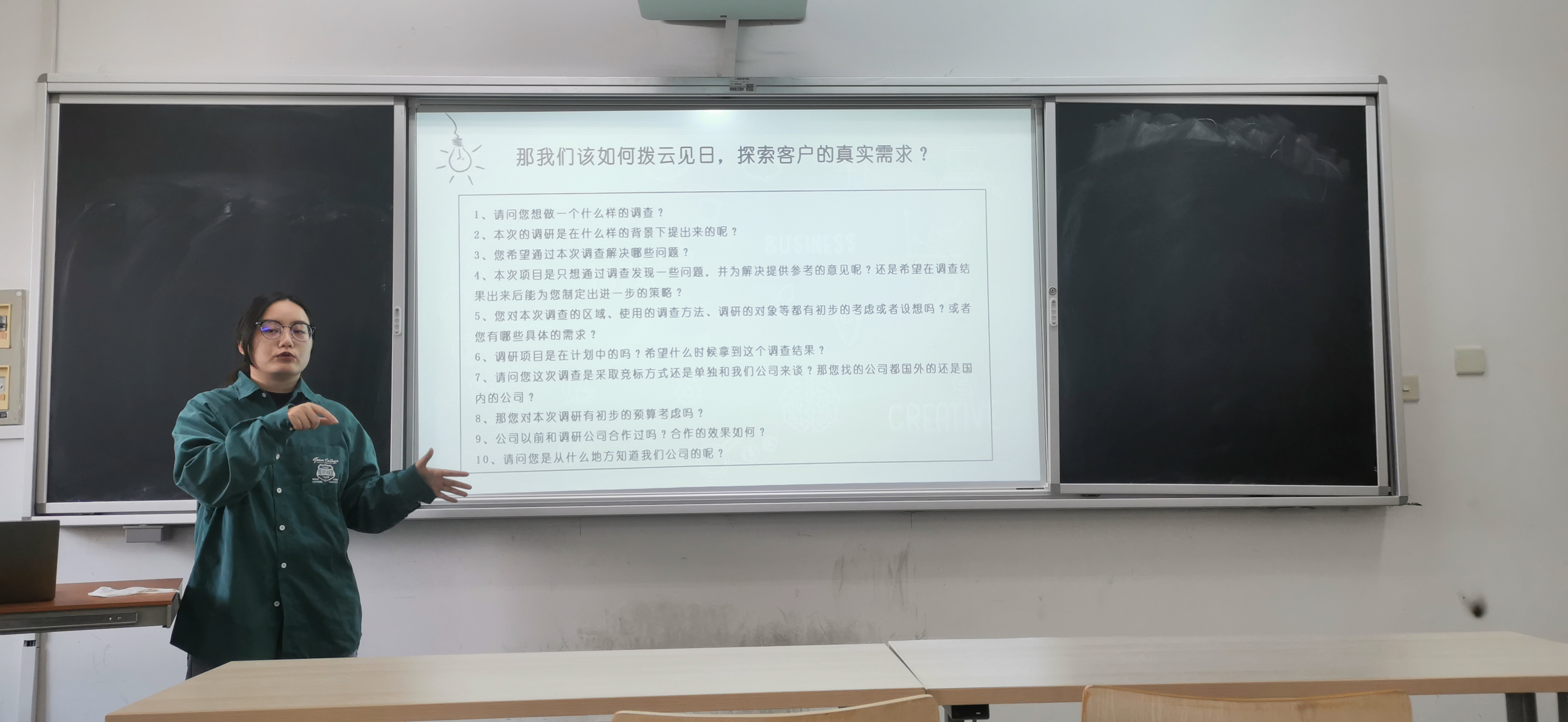 在两次校外课程结束后,企业与公司的老师们为了同学们不脱离知识与书本,决定采取理论与实践相结合的形式,开展校内课程。在两次的课堂学习中,零点有数的老师分别以“定性与定量研究方法的应用”以及“扒开表面看本质,咨询项目背后的逻辑”两个主题,向同学们传授如何与客户进行沟通和对接的经验与技巧,包括识别各类客户类型、了解询价方案等等,将企业实际运用的方法介绍给大家:将日常的问题通过逻辑思维转化为可证实的科学问题,从而形成详细的研究流程与框架,明确测量和分析数据的具体方法。同时将平日里的学习内容与现实相结合,让同学们明白了在现实工作生活中,总会遇上需求讲述不清晰的情况,这时就要通过逻辑思维转化问题,从而高效地完成任务。课后,企业带教老师也依托零点的真实项目向同学们提供了两项调研策划的任务,为同学们模拟了真实的项目背景。