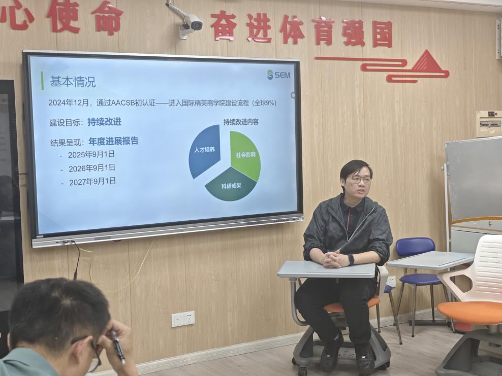 随后,经济团队吴际老师介绍了AACSB国际认证的相关工作内容与进展。吴老师指出,未来三年需以认证为抓手,推动本科课程达成度评估体系与毕业论文质量保障机制深度融合。具体举措包括:对标国际商科教育标准,在体育经管与管理和市场营销专业核心课程中设定9项能力目标,每门课程明确1项核心评估指标。具体包括优化考核工具,鼓励教师结合作业、考试、答辩等现有环节设计标准化量规,逐步建立“目标—测量—改进”闭环。
