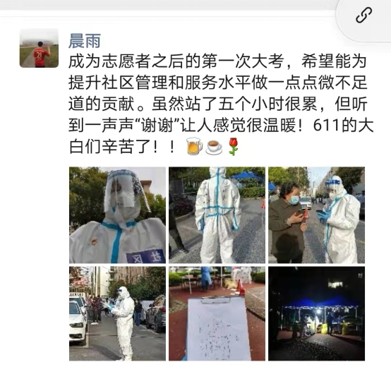 “从核酸检测到班车接驳,从志愿者招募到志愿者培训,我经历了志愿者管理的各个环节。每当疲惫时,日益严峻的疫情形势和共产党员的责任担当让我更加努力投入志愿服务。志愿者服务的不仅是大家,也是我们自己,当每个人扛起一份责任,就能早一天战胜疫情,让生活回归有序。”本科生党支部左鸿滔说:“‘疫情不停,志愿不止’。用‘踏平’而不是‘躺平’为青春注脚,用‘内燃’而不是‘漠然’为抗疫助力!”