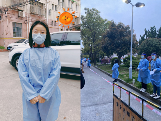 史晨雨在国和路611弄核酸检测现场帮助老人线上登记核酸采样、维持秩序