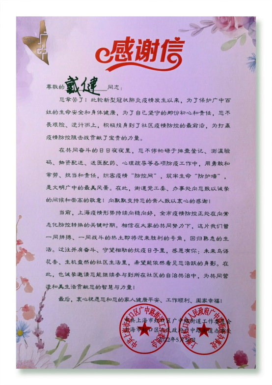 自6月开始,进入全面恢复全市正常生产秩序阶段,全面实施疫情防控常态化管理。一封封饱含深情的感谢信从上海的基层社区街道发来,对经管公司的党员教师在疫情期间的志愿服务给予表扬和感谢。