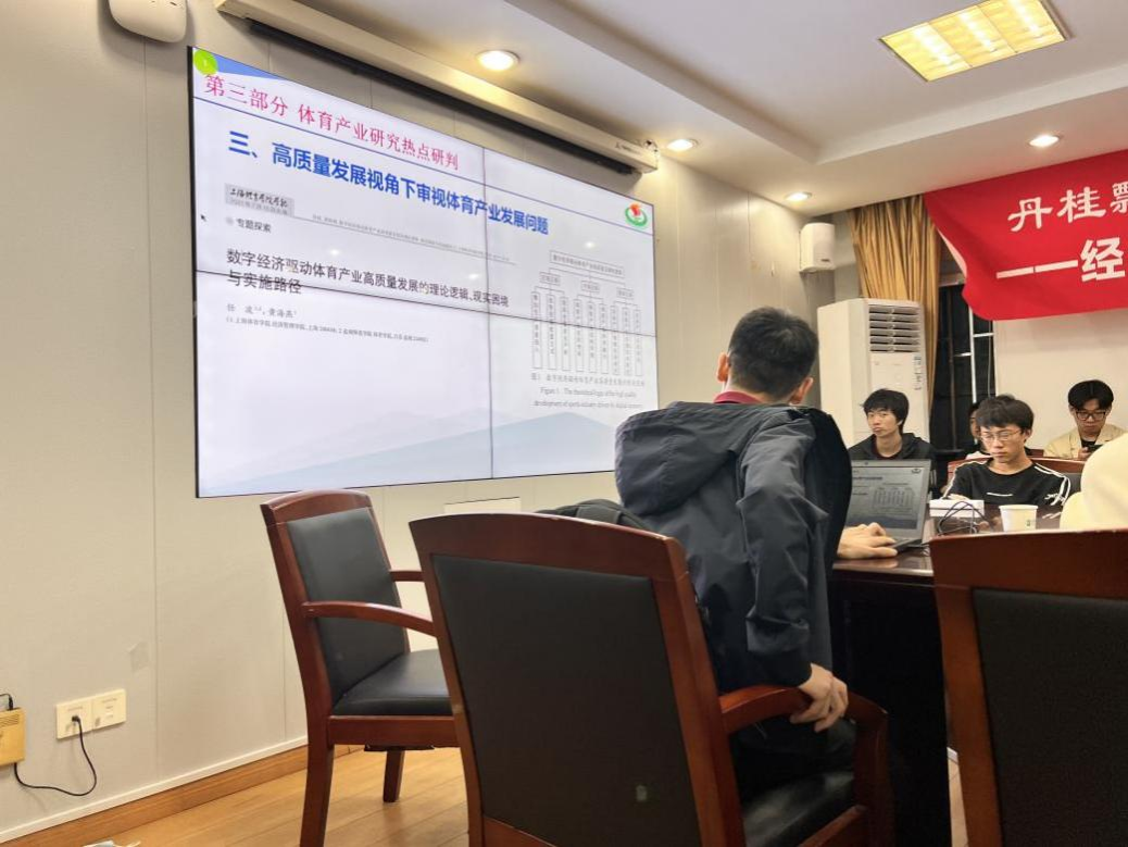 师生共读经典活动种任波老师以产业经济学理论在体育产业发展中的应用为主要内容与我们进行了一场学研、探讨活动。产业经济学是一门体系较为完善的学科,其中的概念也较为复杂,但仁波老师还是用通俗易懂的语言让我们对相关概念有了一个基础的认识。随后,任波老师也为我们介绍了体育产业的现状趋势、研究热点,我也大受启发。任波老师也分享了他在贵州研学时的经历,也引人深思,村BA热潮席卷全国,其中的原因机理、现存问题、运行机制都可以成为我们的研究内容,真是收获颇丰。