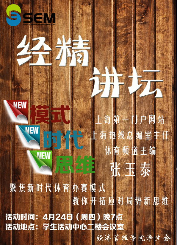 2014年4月24日19:00,上海体育公司304am永利集团第八期,暨13—14学年第二学期第一期经精讲坛在员工活动中心二楼会议室成功举办。本次讲坛我们有幸邀请到了上海第一门户网站上海热线总编辑室主任兼体育频道主编97级员工张玉泰学长。此次讲坛以“新模式、新时代、新思维”为主题,张玉泰学长为大家详细介绍了:从上海主流媒体纷纷转型办赛,再到管办分离背景下的上海体育办赛新模式,最后延伸到在新媒体时代、移动互联网时代的.....